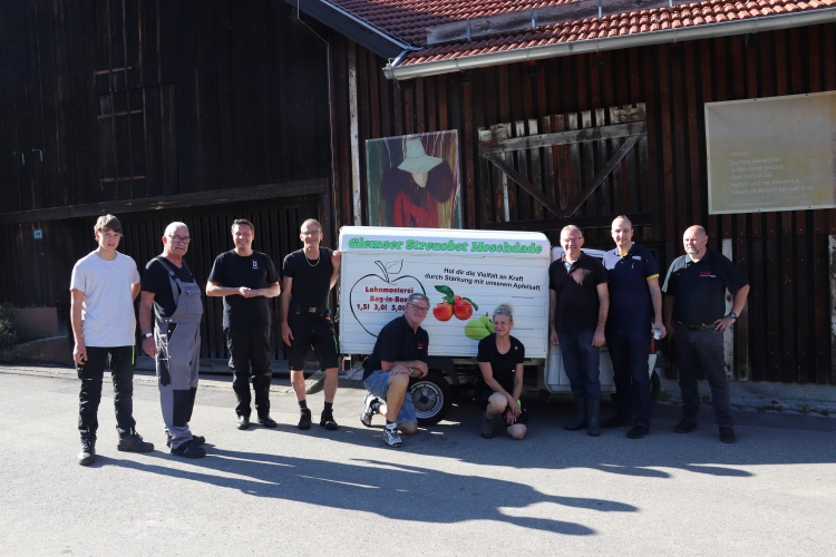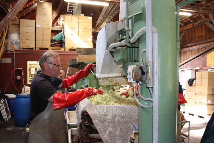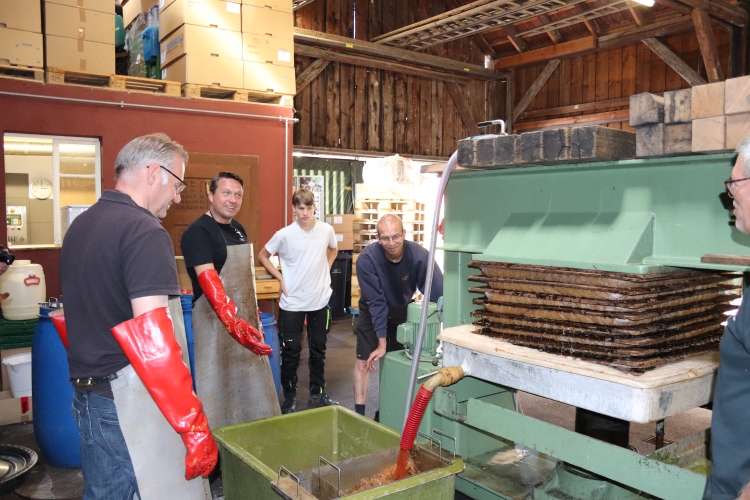 Weiter ging es zum Mosten in der Glemser Streuobst-Moschdade. Zum Einsatz kommt dort eine Lauffer Presse von 1972, die reibungslos funktioniert. Sie kann acht Zentner, das sind 400 Kilogramm, laden. Für das Pressen von Saft benötigt man 20 Minuten Zeit. Während uns Holger und Horst Wahl das Mosten erklärten und Hintergrundinformationen gaben, wurden Manuel Hailfinger und ich von vielen Mitgliedern des CDU Stadtverbands Metzingen aufmerksam bei der Arbeit beobachtet. Mosten macht sehr viel Spaß, doch eine Gummischütze und lange Handschuhe machen durchaus Sinn, denn nicht nur der Duft von Äpfeln liegt in der Luft, auch die gemahlenen und geraspelten Äpfel verteilen sich gerne überall. In Glems kann man ab 50 Kilogramm Obst den Saft aus den eigenen Früchten herstellen lassen. Auch die Veredelung mit beispielsweise Sauerkirschen, Rhabarber oder Holunder ist möglich. Abgefüllt wird in Bag in Box oder Fässern. Es gibt auch Druckfässer, die 50 Liter fassen, allerdings deutlich teurer sind.