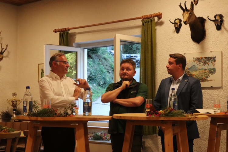 In der anschließenden Diskussion ergriffen die anwesenden Jäger und Förster das Wort. Insgesamt waren 38 Personen gekommen. Einhelliger Tenor war, dass keiner mehr Rücksicht nehme. Mountainbiker, Wanderer und Reiter ließen sich von Verbotsschilder nicht zurückhalten, teilweise ginge es noch spät abends und mit hellen Stirnlampen in den Wald. Die Tiere kämen dadurch nicht zur Ruhe. Markus Schuler, der Kreisjägermeister von Hechingen, lenkte die Diskussion und moderierte unsere Podiumsrunde, an der auch Manuel Hailfinger teilnahm.